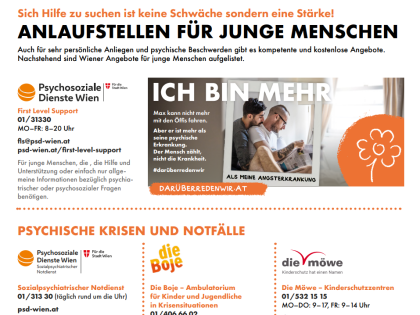 Dieses Infoblatt bietet eine Übersicht unterschiedlicher Anlaufstellen rund um psychische Gesundheit für junge Menschen in Wien.